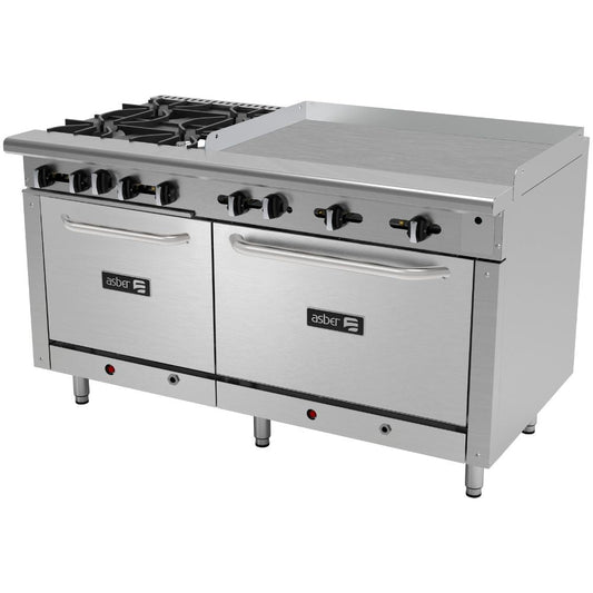ESTUFA ASBER COMPLETA AEMR-2-G36-B4-60-H | Estufa | 4 Quemadores | Doble Horno 24" y 36" | Plancha 36" | Parrilla | Gas | Acero Inoxidable | Comedor Industrial Hotel Cafetería Bistró Restaurante