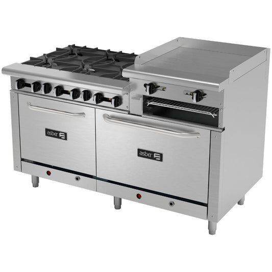 ESTUFA ASBER MULTIPLE AEMR-2-RG24-B6-60-H | Estufa | 6 Quemadores | Gratinador | Plancha 24" Elevada | Horno Doble 24" y 36" | Parrilla | Gas | Acero Inoxidable | Comedor Industrial Hotel Cafetería Bistró Restaurante