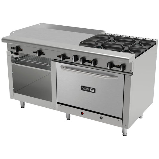 ESTUFA ASBER MULTIPLE AEMR-G24-B6-60-H | Estufa | 6 Quemadores | Gratinador | Plancha 24" | Parrillas | Horno 36" | Gas | Acero Inoxidable | Cafetería Comedor Industrial Hospital Restaurante